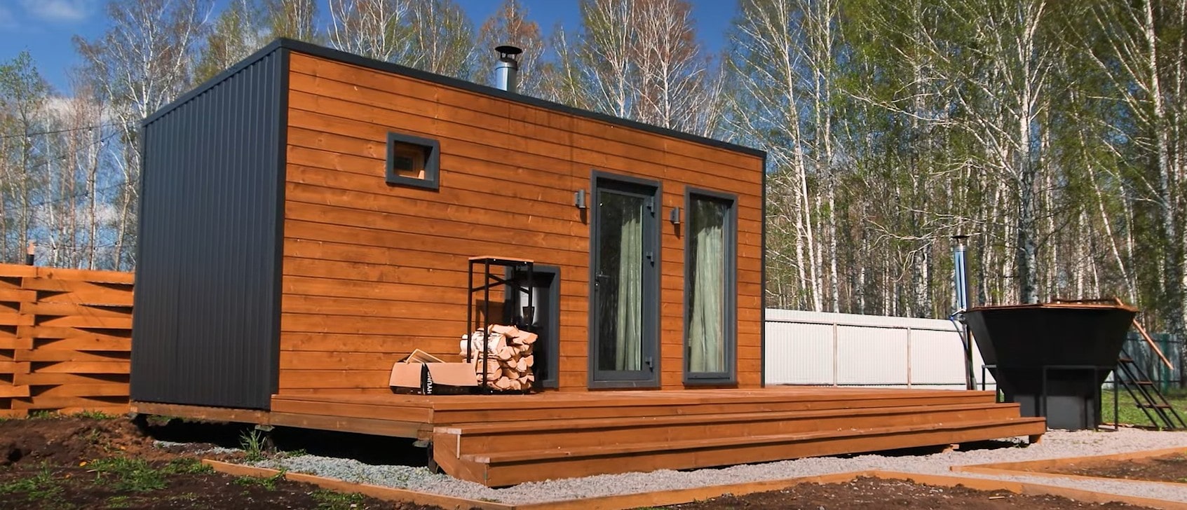 Це сучасна баня в скандинавському стилі, що поєднує мінімалізм, функціональність та панорамний дизайн. Завдяки модульній технології вона мобільна та готова до використання одразу після встановлення на ділянці.